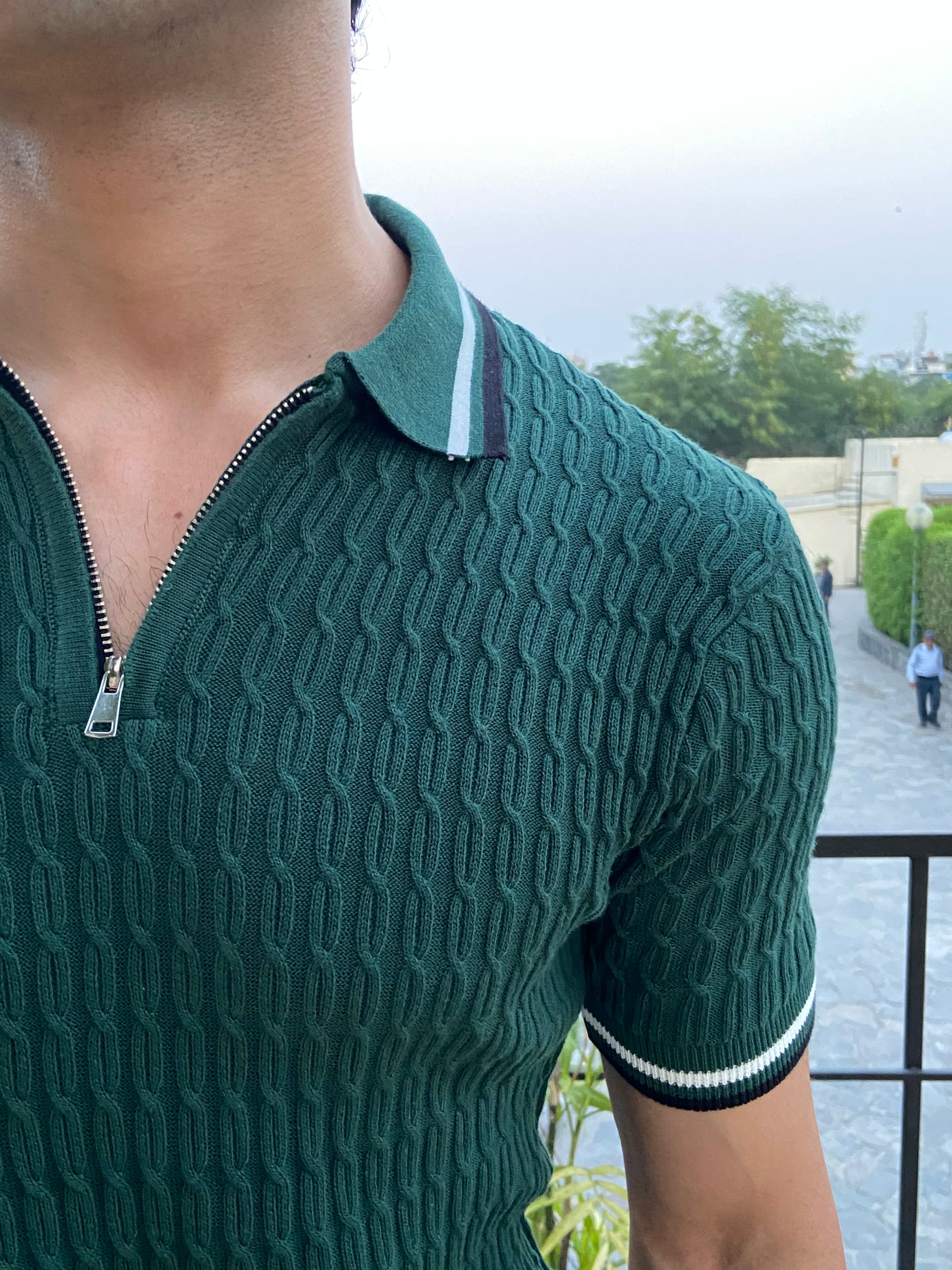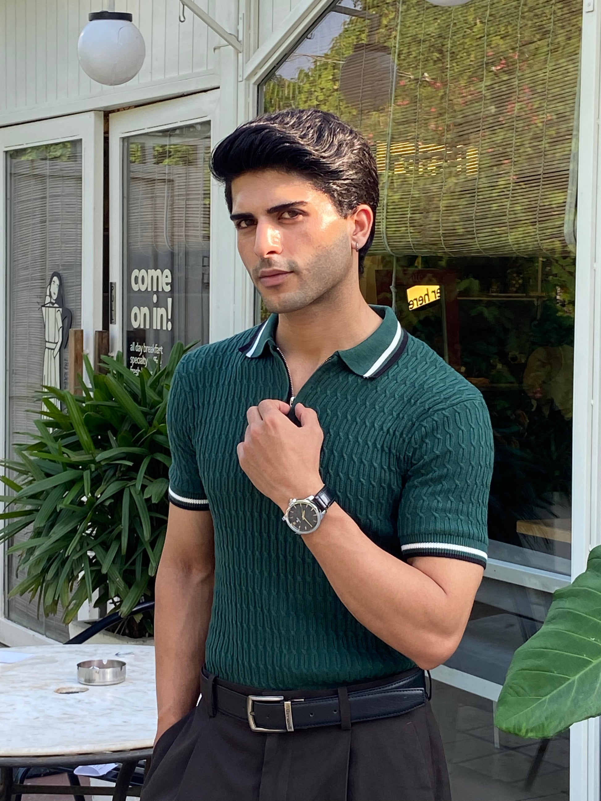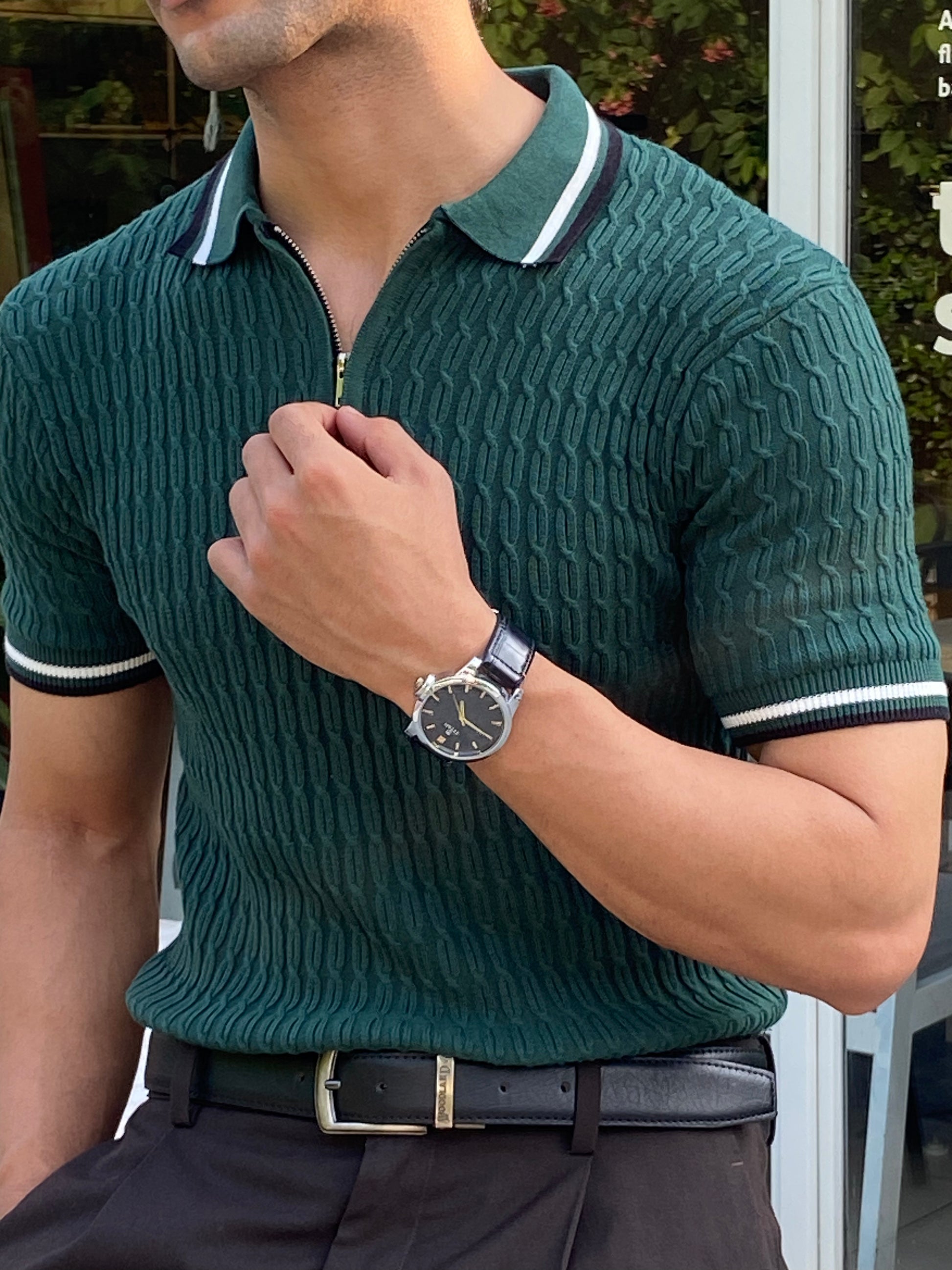 Elevate your casual wardrobe with the Léclairé Zip Polo—a modern expression of refined heritage. Crafted from premium yarns, this polo features a rich forest green hue and an intricate jacquard knit pattern, delivering depth, texture, and undeniable sophistication.